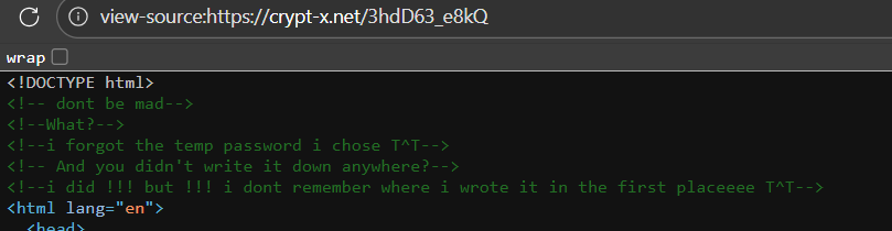 In the account 3hdD63_e8kQ, a developer conversation can be found within the site’s code. Kitty mentions losing the temporary password she created for the account and not remembering where she left it.
